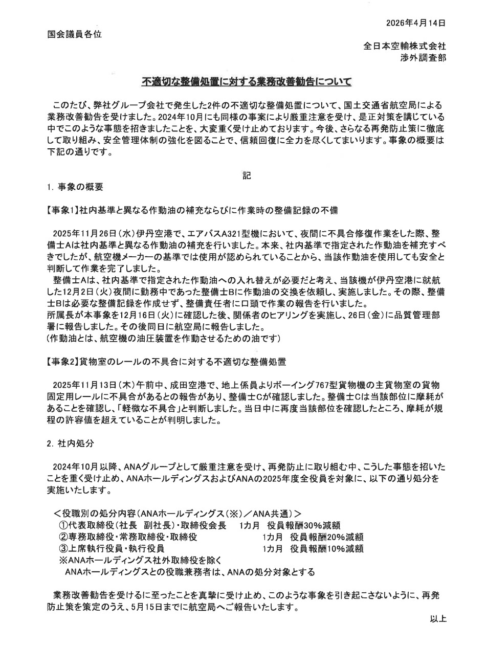 ANAに業務改善命令