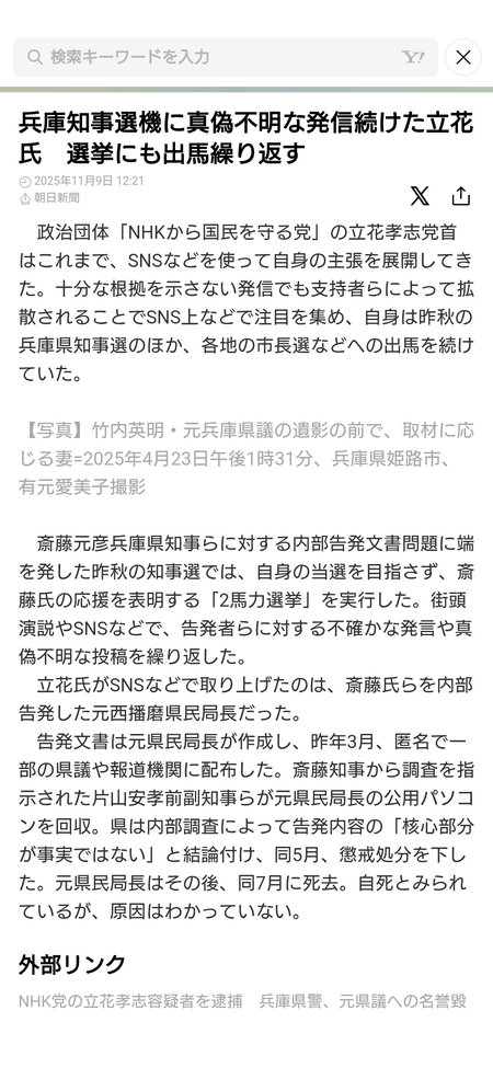 NHKと総務省の利権集団が今回の後押しなのかな。おそらくね。立花はやりすぎだけどもここまでいろいろかき回した功績もある。まあ、邪魔なトリックスターは潰せという下民使用人たちの力だね。純粋に名誉毀損だけなら大した話でもないのに、カスゴミが一斉に同時に細かい話しを書くってのは、つまり当局もつるんでる、いやむしろ当局が書けと言ってるってことよ。