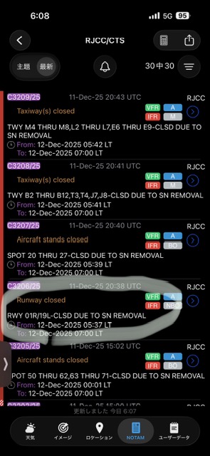 HOME > 貴様ら!俺の言うことを聞いてみませんか? >滑走路除雪頑張れ 2025/12/12 06:15 天気はまず大丈夫 雪より風の方がやばいから。あとは着氷しないで一発着陸することをことを祈るだけ 翼に1cm着氷すると揚力が8%さがる、で大体合ってるかな。こないだ小泉防衛大臣がシナのインチキ航空音声に反論して言ったNOTAMとはこういう情報を含む航空情報をいう。 滑走路が7時まで一本クローズになってる→今そこ除雪・防氷してる、たぶん、と見りゃわかるわけ。シナはバカだから、みんなが知らないと思って好き勝手いうが、そんなもんに騙されるのはいまやオールドメディアのバカしかいないと知れ。